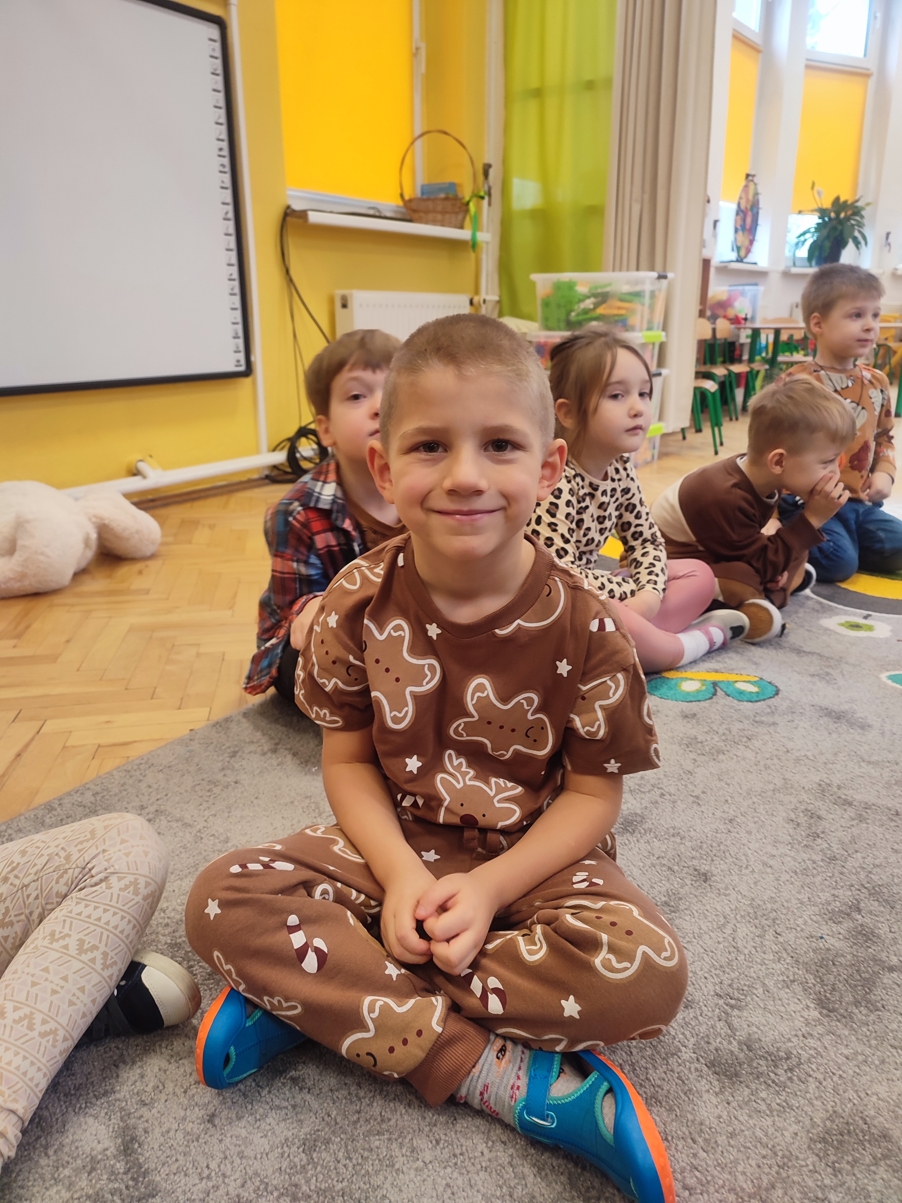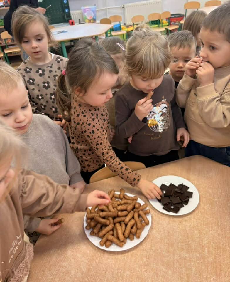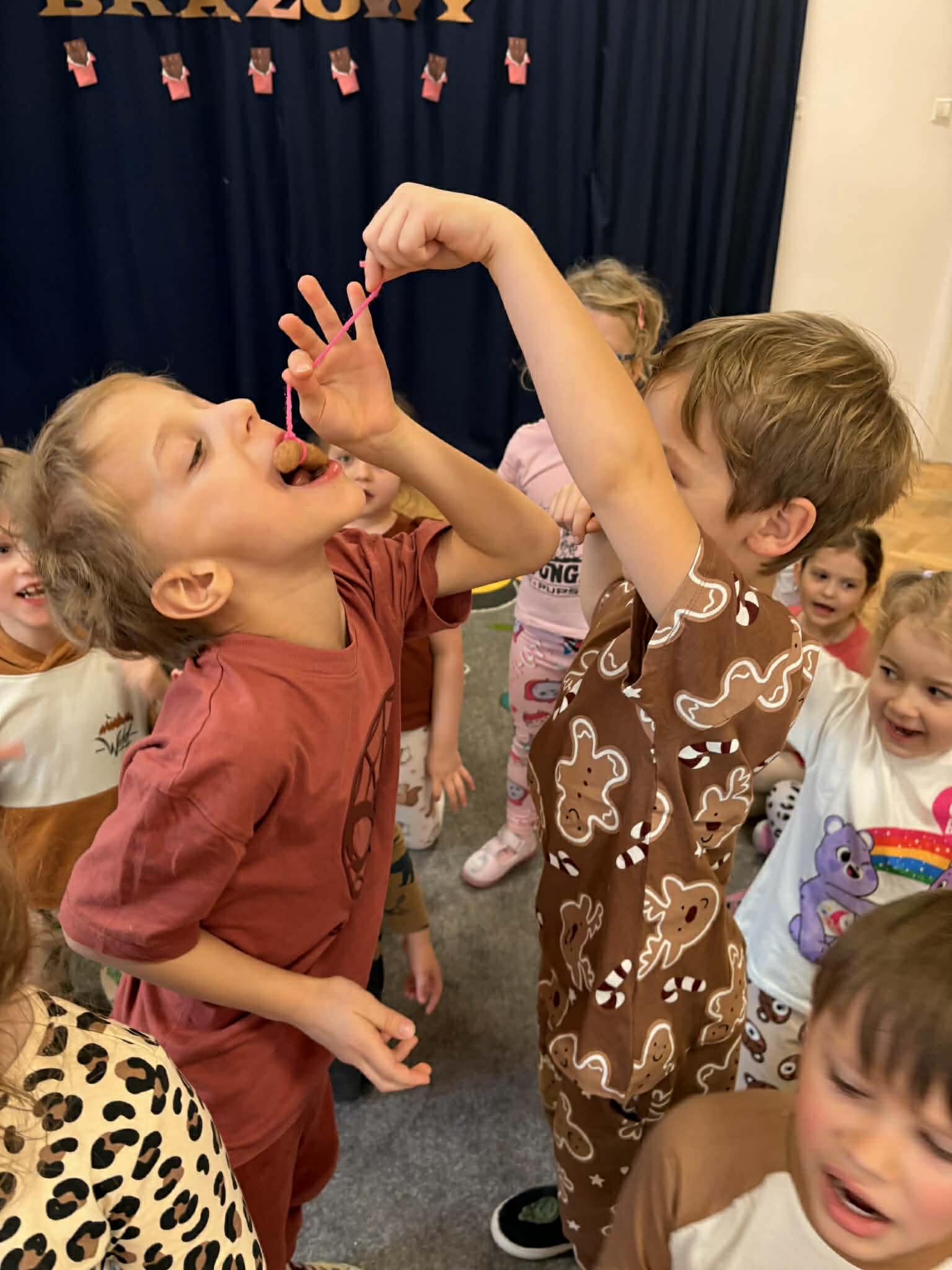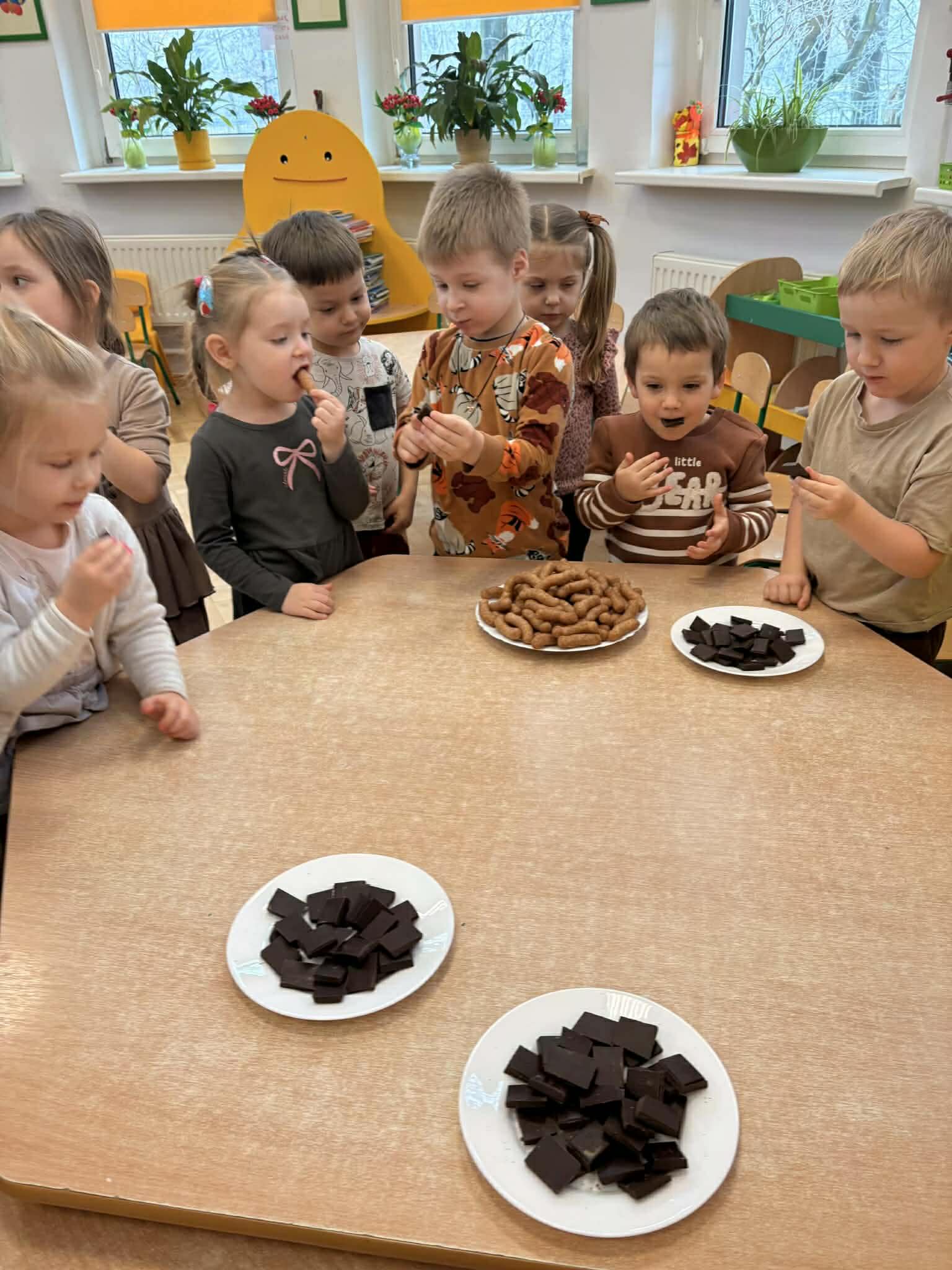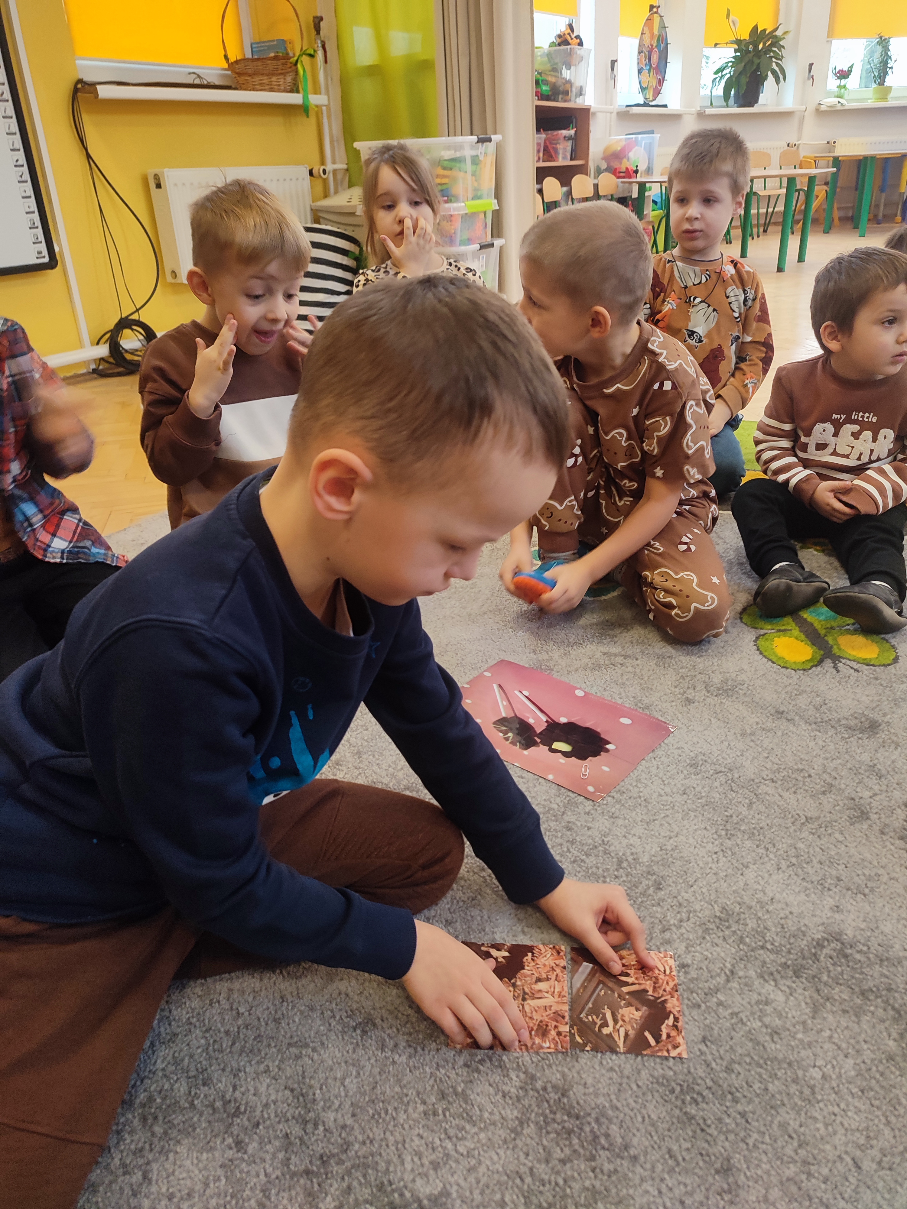 W naszym przedszkolu obchodziliśmy Dzień Brązowy. Dzieci przyszły ubrane w brązowe elementy stroju i odkrywały, gdzie w przyrodzie występuje ten kolor — m.in. w kasztanach, korze drzew czy czekoladzie. Przedszkolaki brały udział w zabawach sensorycznych z jesiennymi naturalnymi materiałami, wyszukiwały brązowe przedmioty w sali oraz stworzyły prace plastyczne w odcieniach brązu. Był to dzień pełen radości, zabawy i utrwalania znajomości koloru. Na zakończenie dnia dzieci spróbowały brązowych przekąsek, takich jak pełnoziarniste chrupki, rodzynki czy herbatniki, rozmawiając o zdrowym odżywianiu.