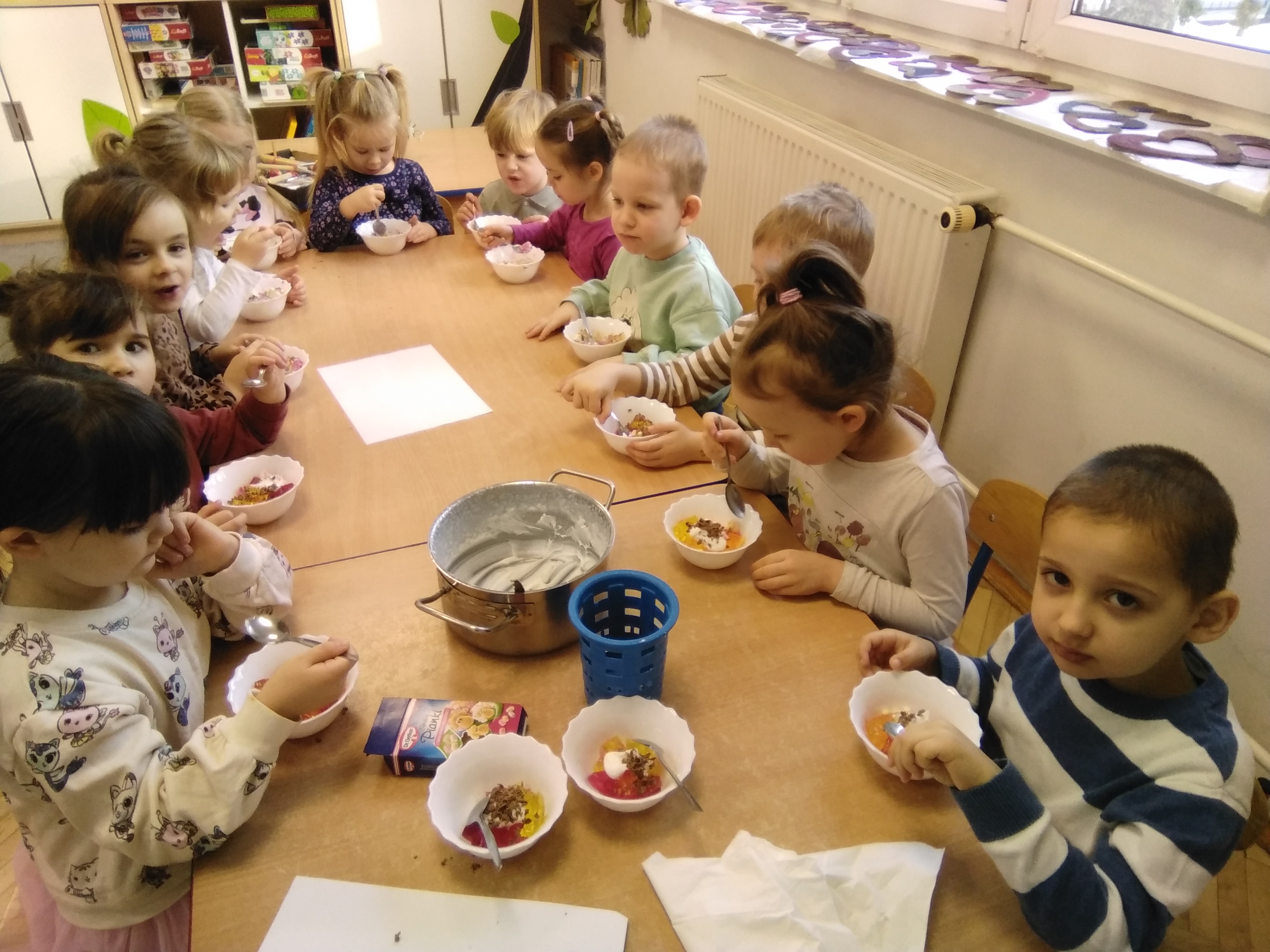Galaretka w smakach trzech i bita śmietana, startą czekoladą też lekko posypana. O, jakie to pyszne jest! Robi się prędziutko. Tylko jeden feler, bo... je się bardzo krótko.